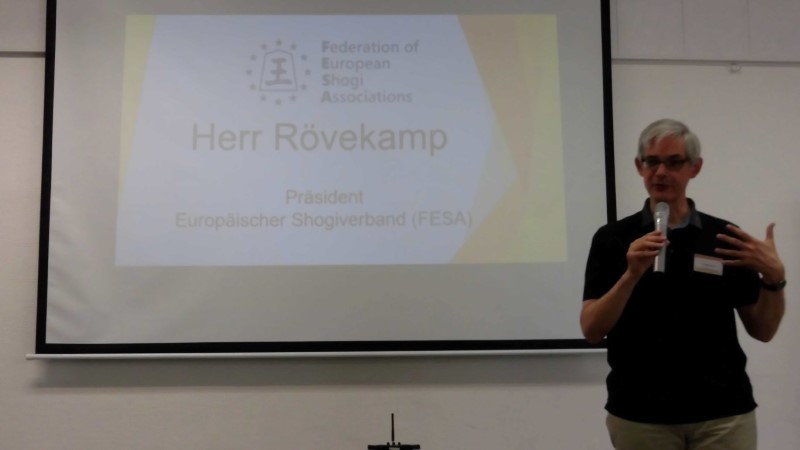 Der Ehrengast Prof. Rövekamp (Präsident des europäischen Shogiverband FESA) berichtete, dass in Japan ein großer Shogi-Boom